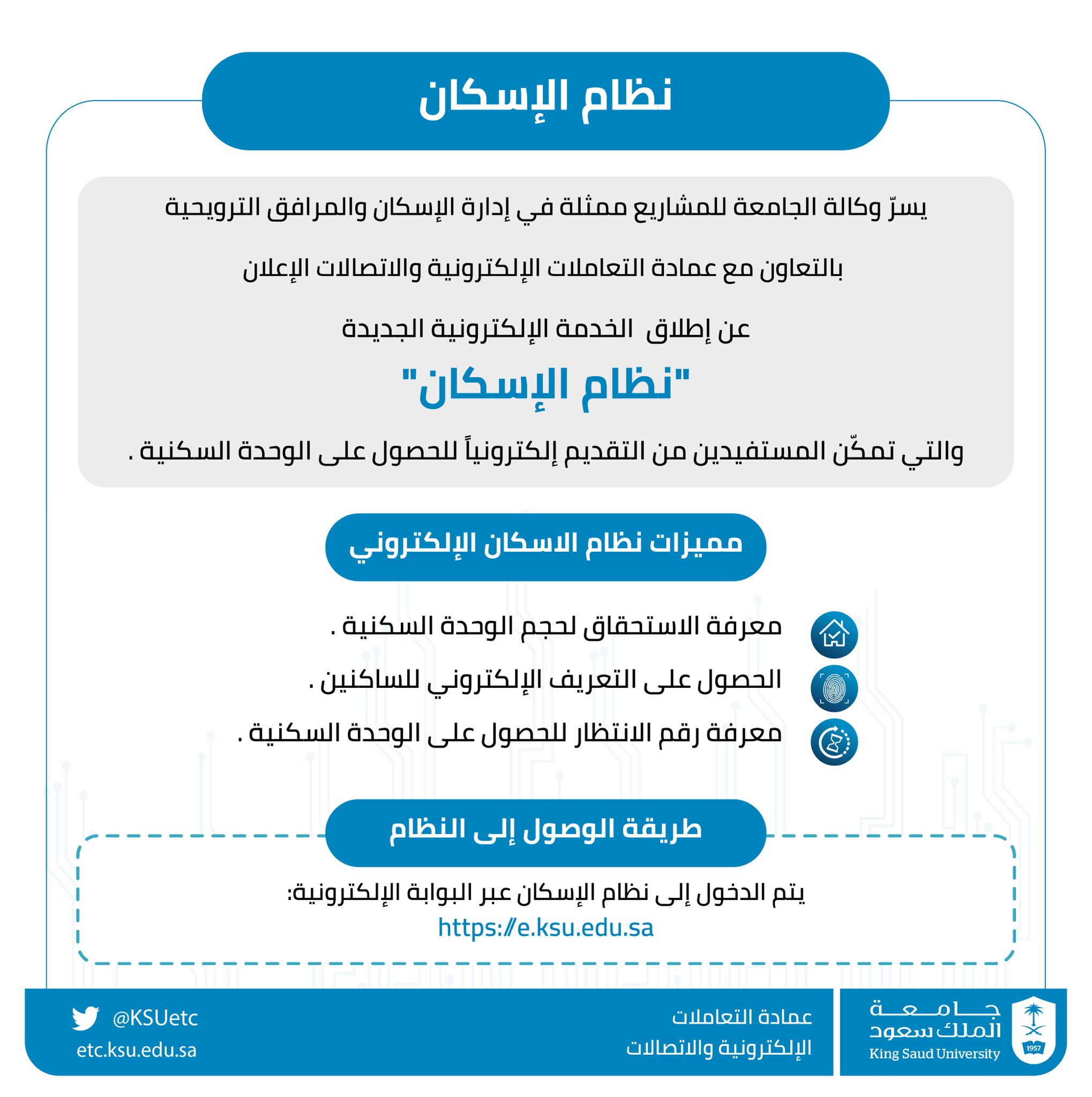 جامعة الملك سعود Twitterissa أطلقت وكالة الجامعة للمشاريع خدمة نظام الإسكان بالتعاون مع عمادة التعاملات الإلكترونية حيث تمك ن المستفيد من التقديم إلكتروني ا للحصول على وحدة سكنية من خلال الدخول على نظام الإسكان