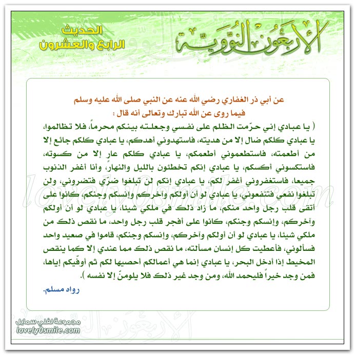 يا عبادي إني حرمت الظلم على نفسي وجعلته بينكم محرما فلا تظالموا يا عبادي كلكم ضال إلا من هديته لفلي سمايل