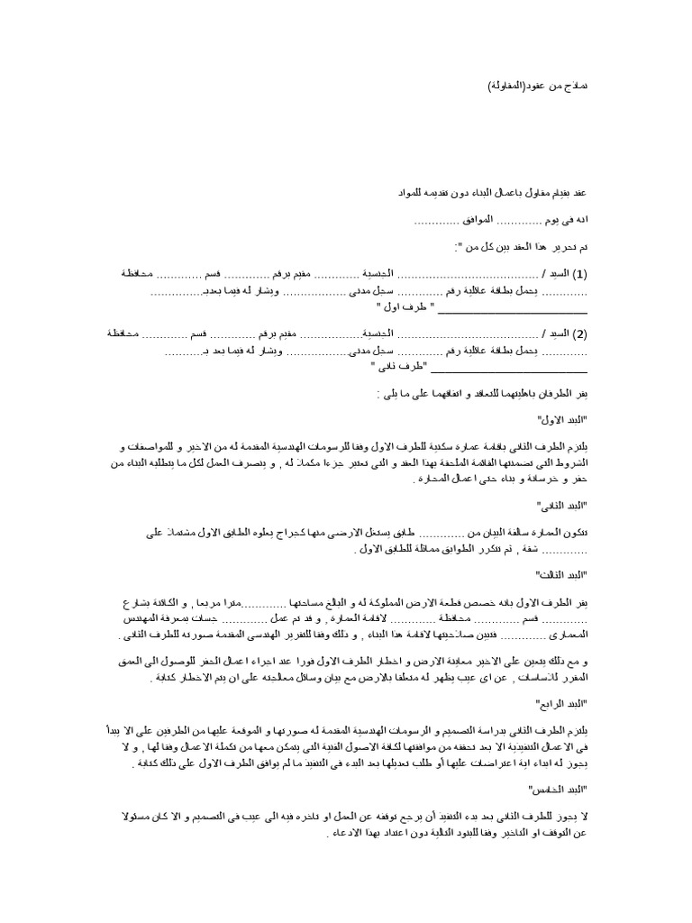 صيغة عقود المقاولات عقد اتفاق بين طرفين مقاولات