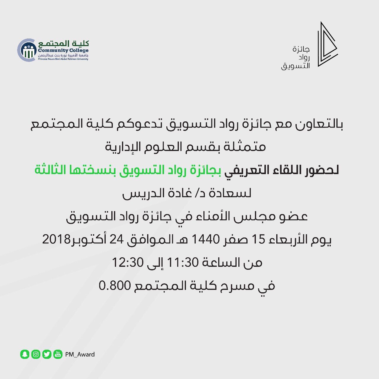 جامعة الأميرة نورة On Twitter دعوة من كلية المجتمع بالتعاون مع جائزة رواد التسويق لحضور اللقاء التعريفي بجائزة رواد التسويق بنسختها الثالثة يوم الأربعاء ١٥ صفر ١٤٤٠ هـ الساعة ١١ ٣٠ إلى ١٢ ٣٠ في