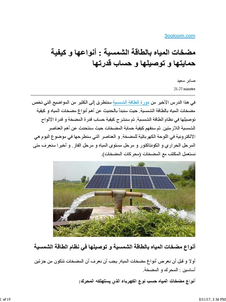 مضخات المياه بالطاقة الشمسية أنواعها و كيفية حمايتها و توصيلها و حساب قدرتها العلوم سبيلنا