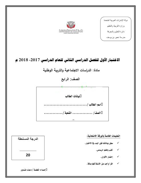 الاختبار الاول في مادة الاجتماعيات للصف الرابع الفصل الدراسي الثاني 2017 2018