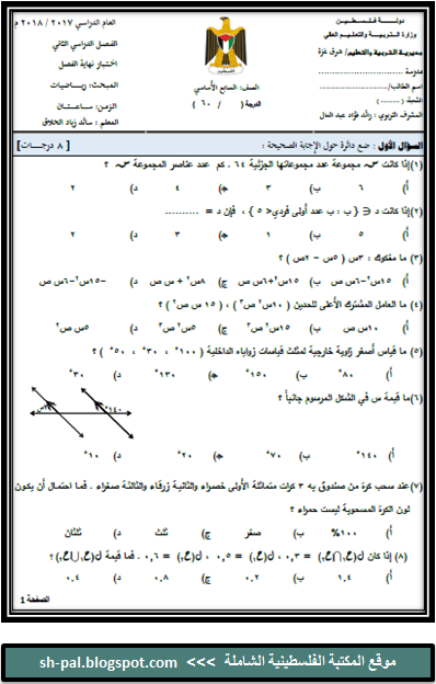نماذج اختبار نهاية الفصل الثاني في الرياضيات للصف السابع ارض اليايا