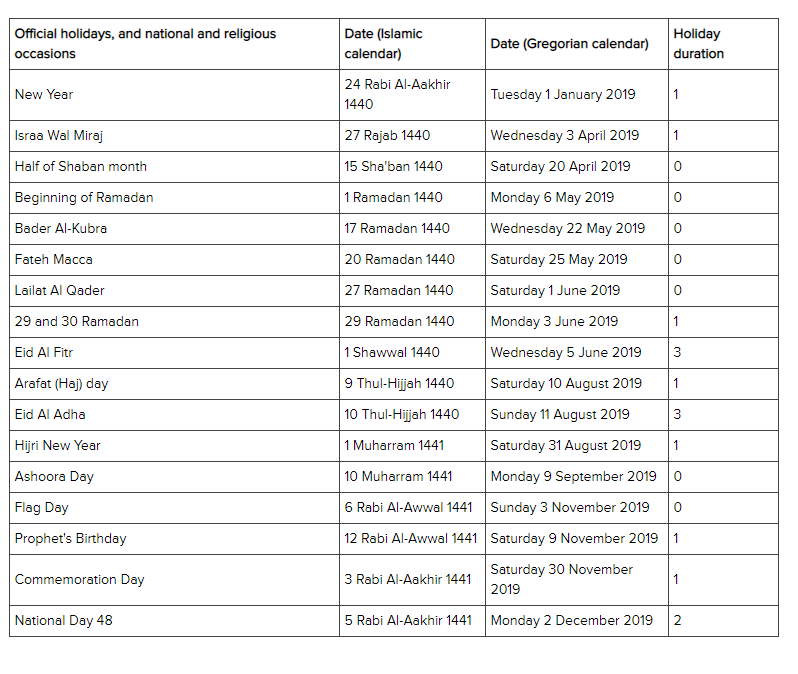 Khaleej Times Holidays 2019